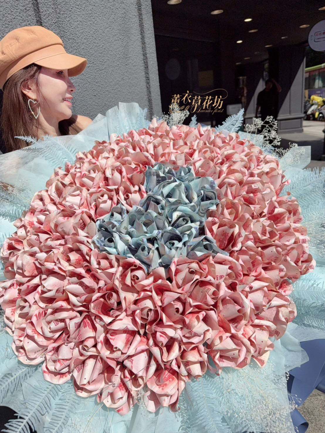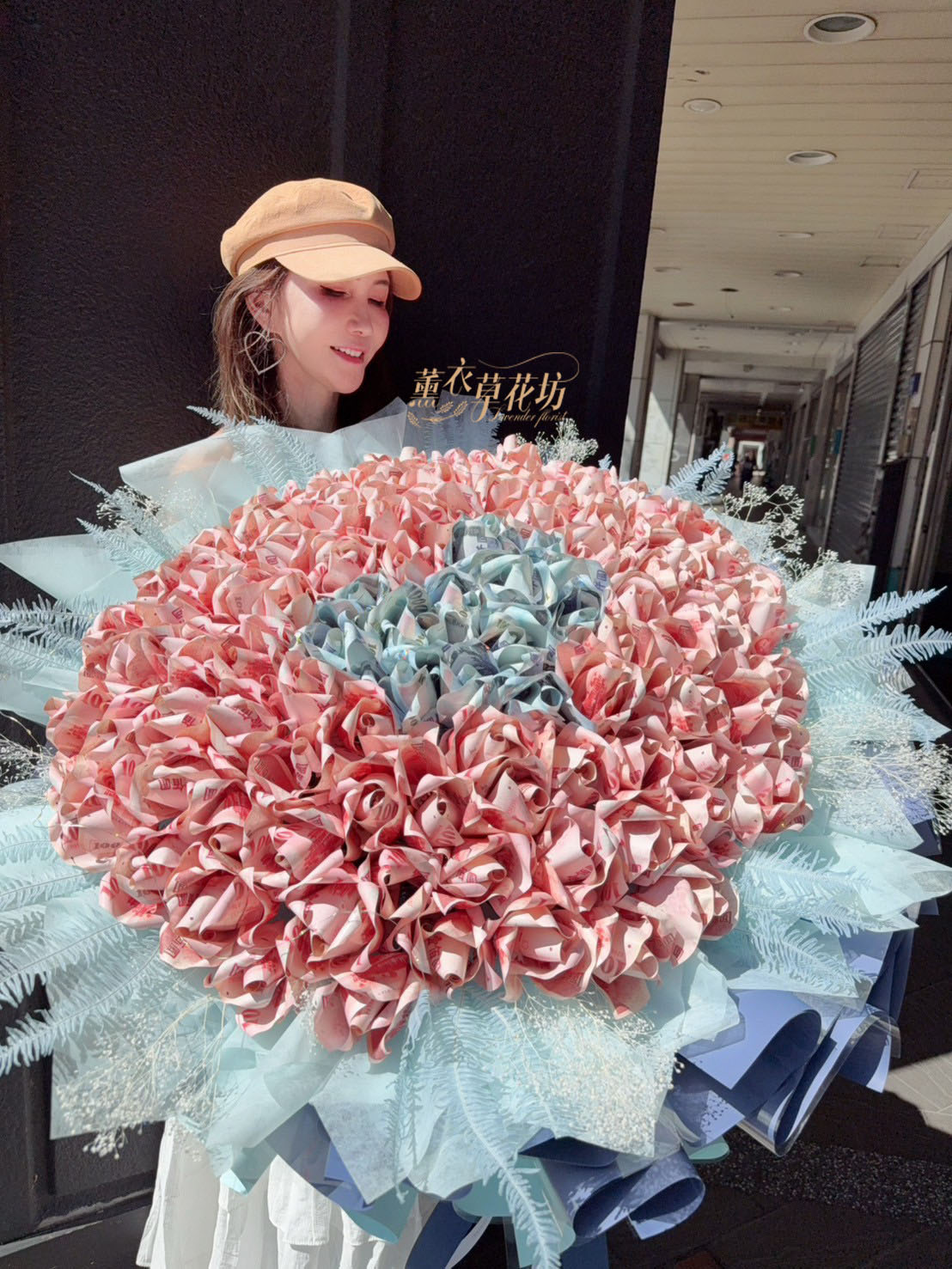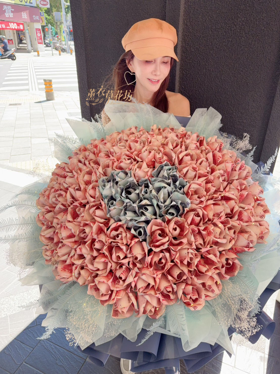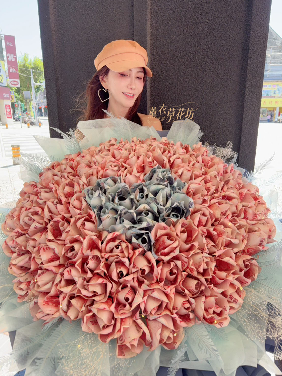 (此圖片是鈔票折法為玫瑰方式.共100朵鈔票玫瑰)此做工繁複.請10天前預訂.