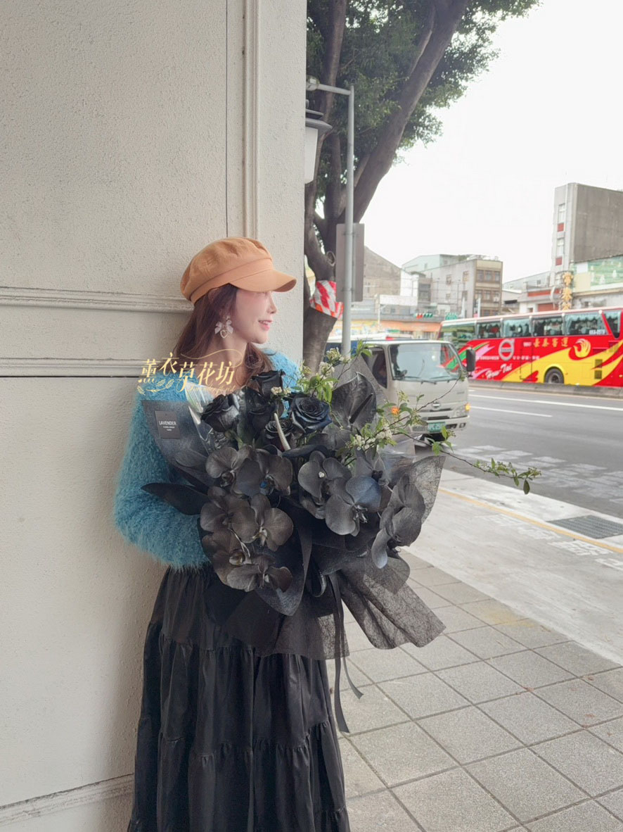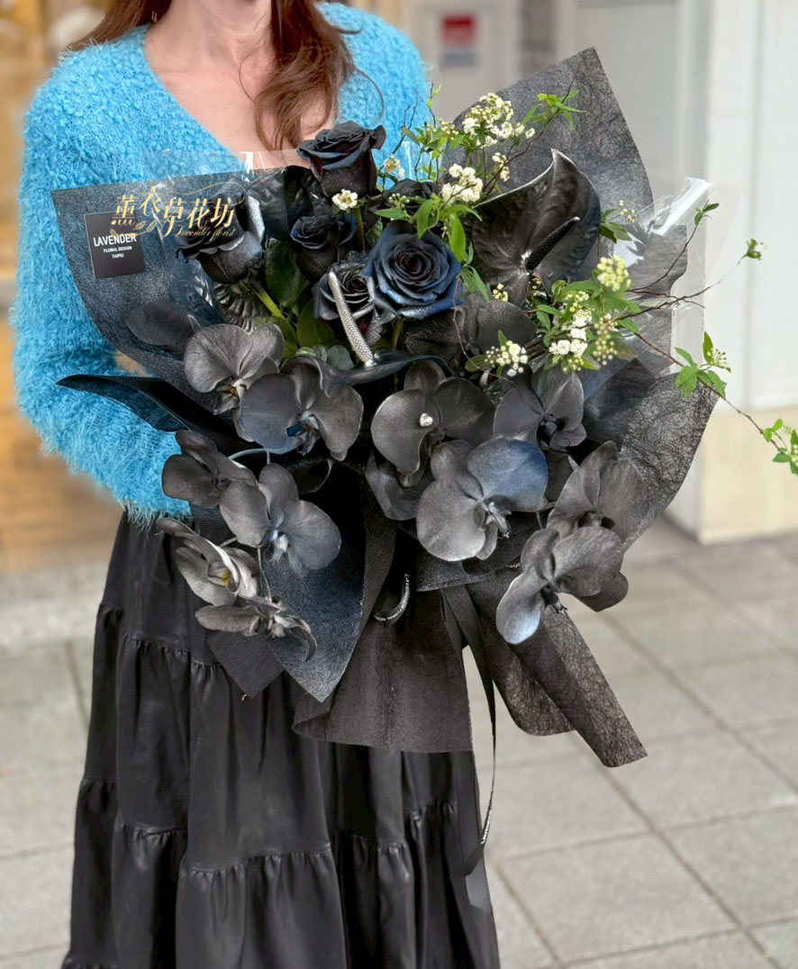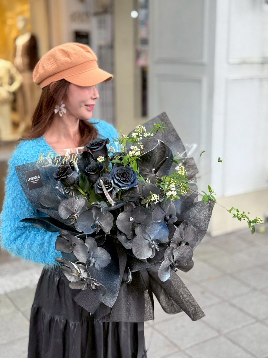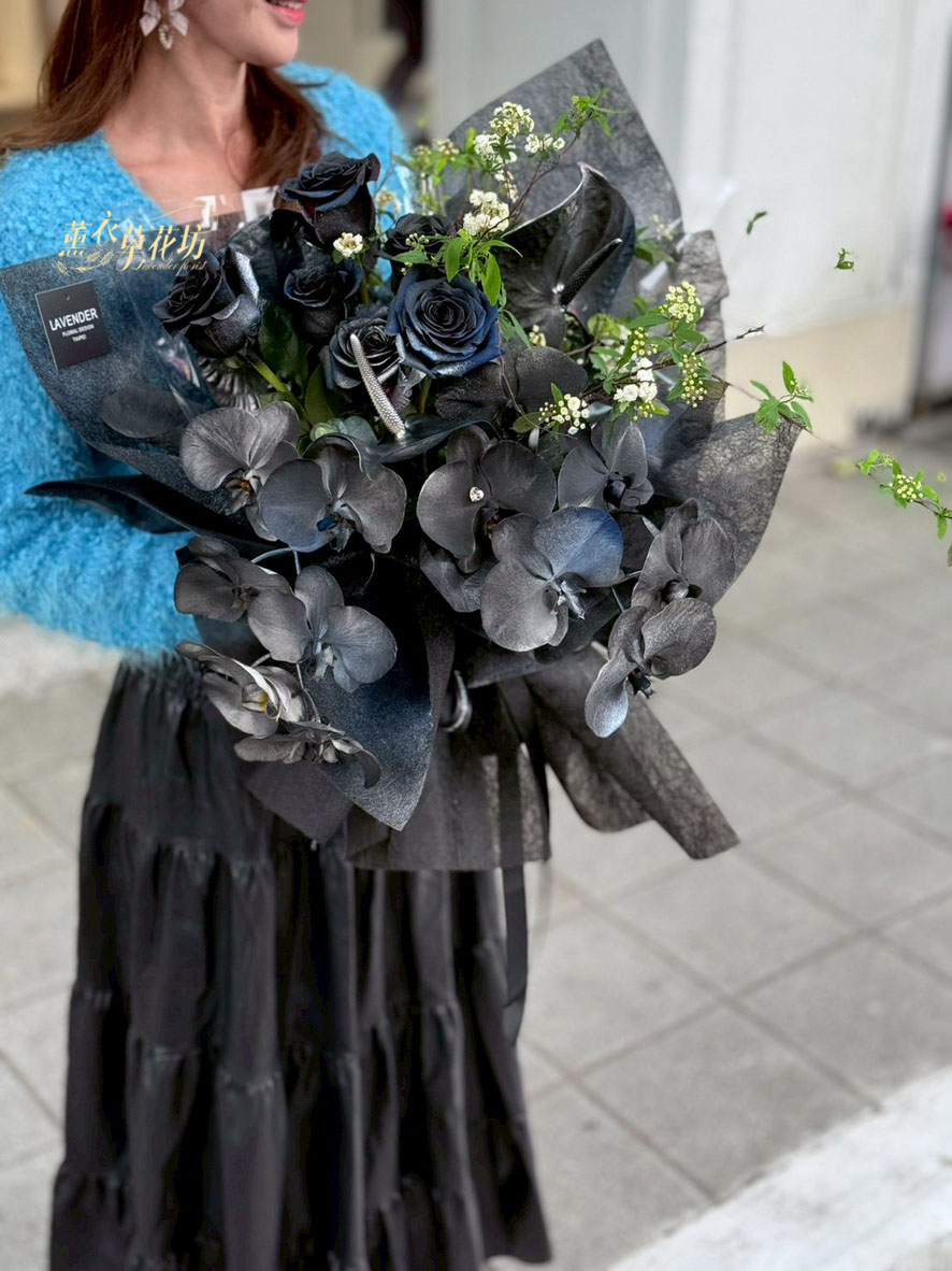 選用特殊染色蘭花、染黑玫瑰,搭配霧感包裝與流線絲帶,