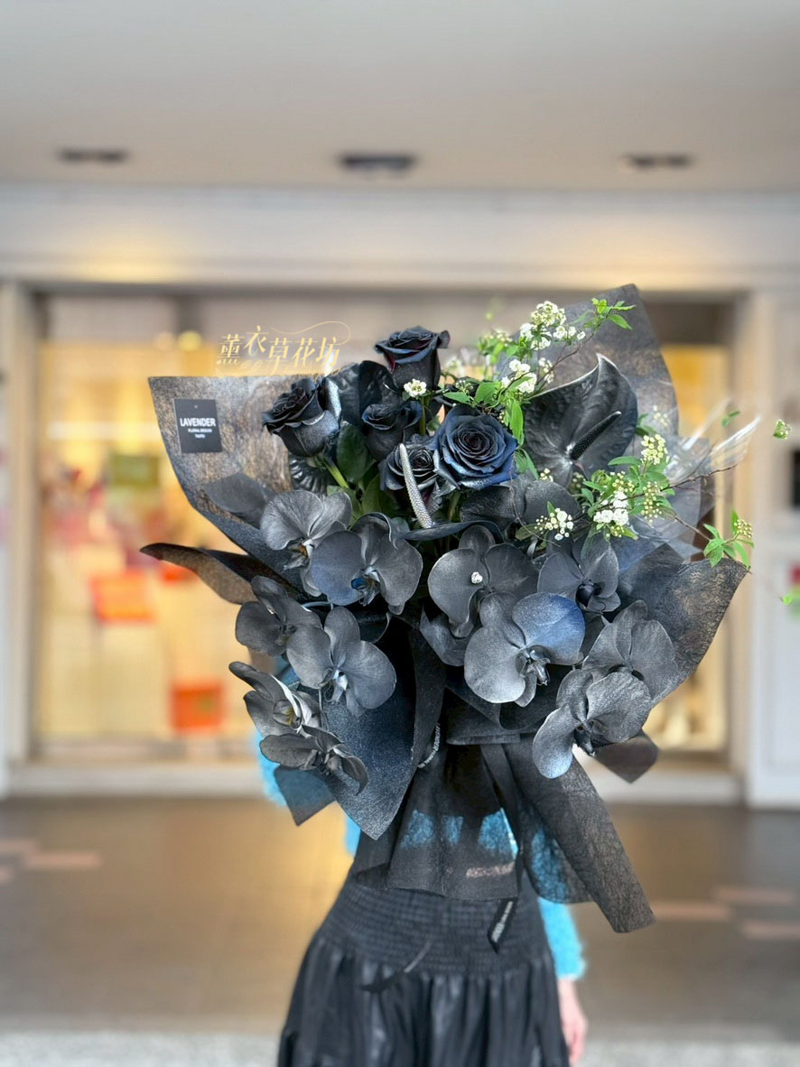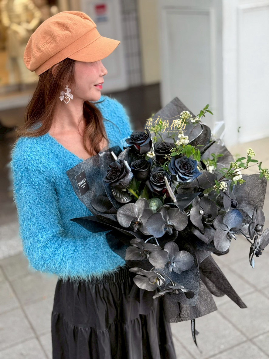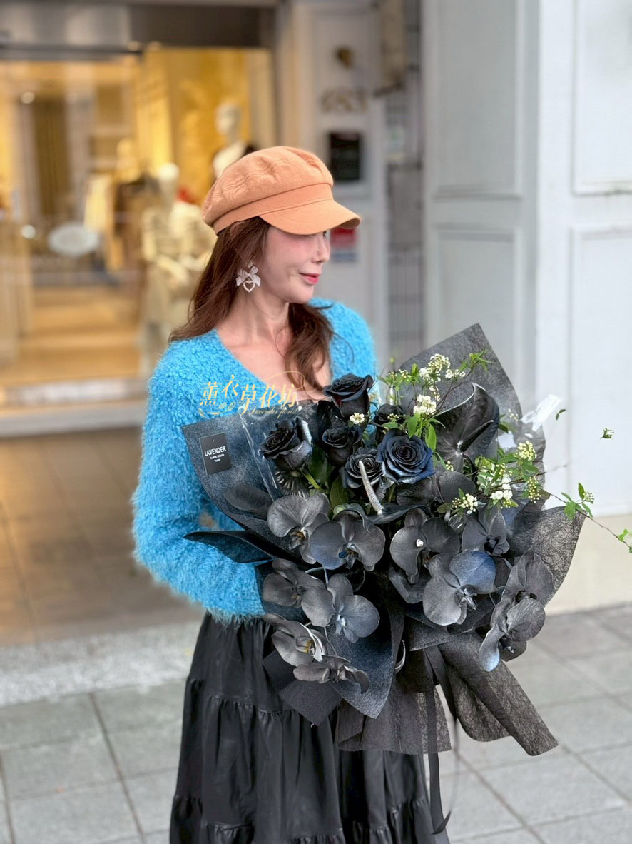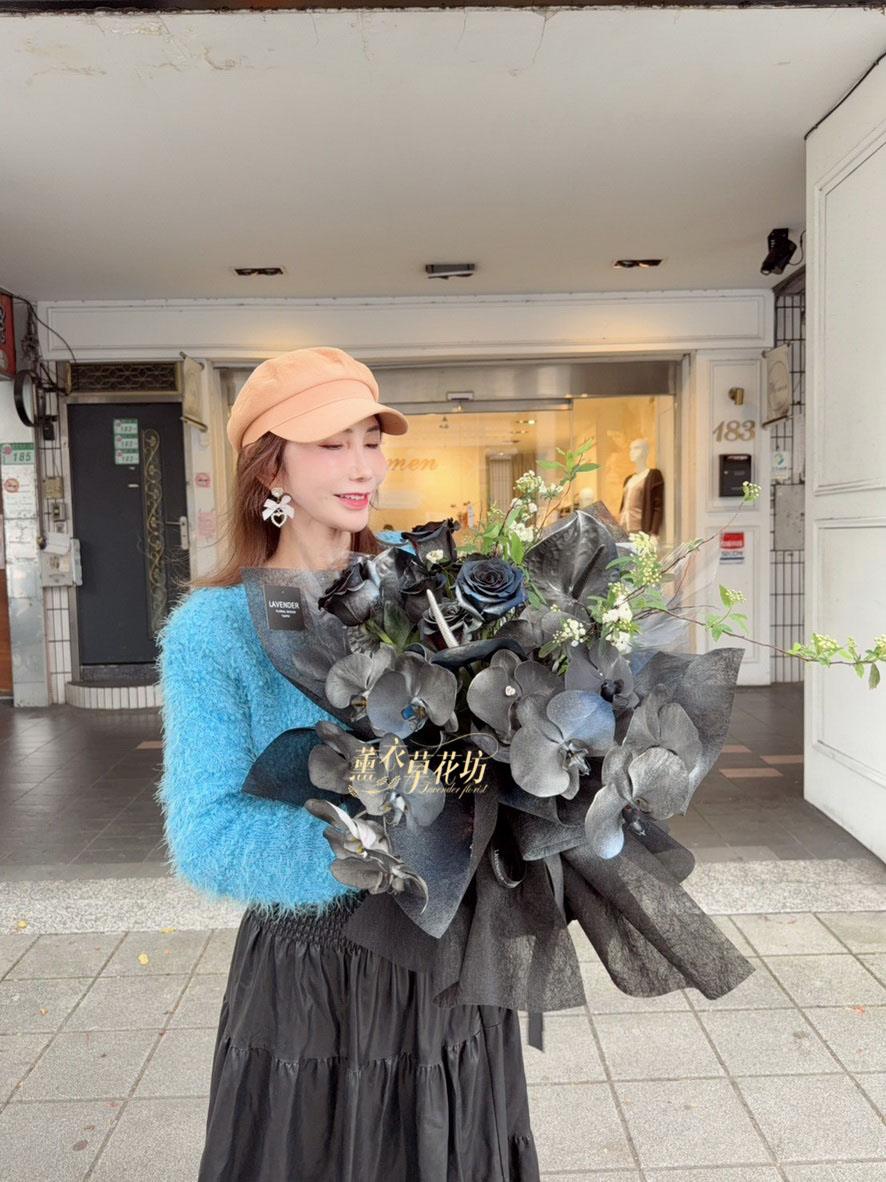 選用特殊染色蘭花、染黑玫瑰,搭配霧感包裝與流線絲帶,