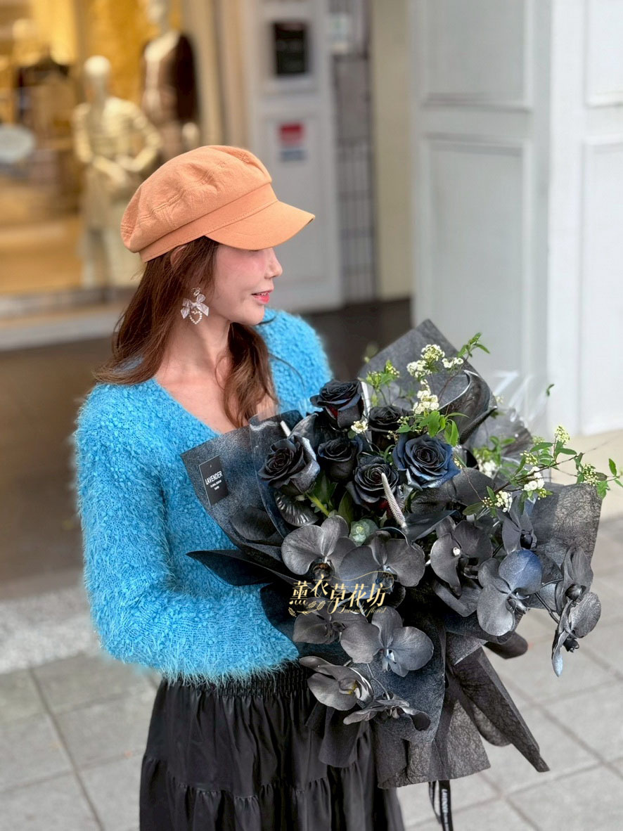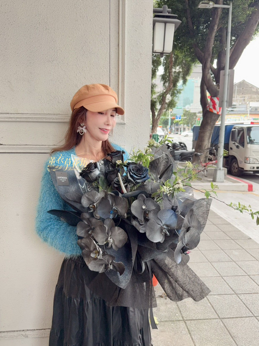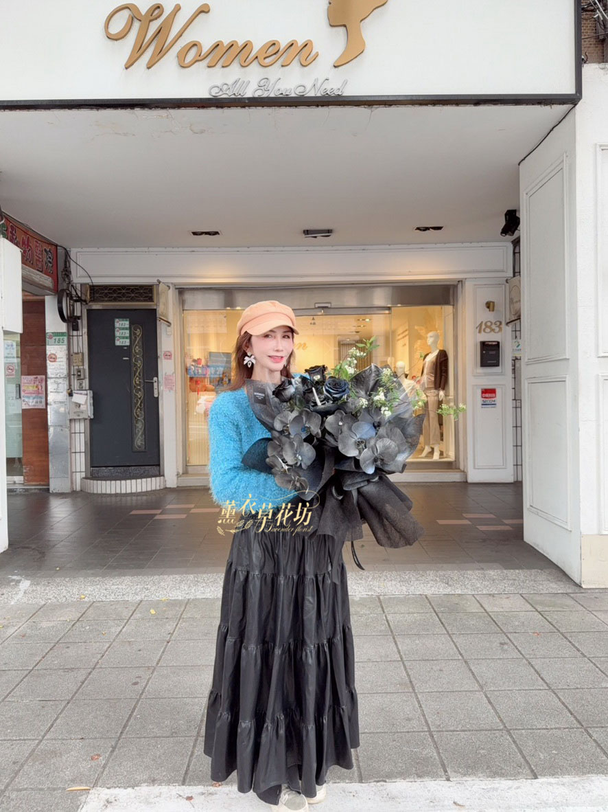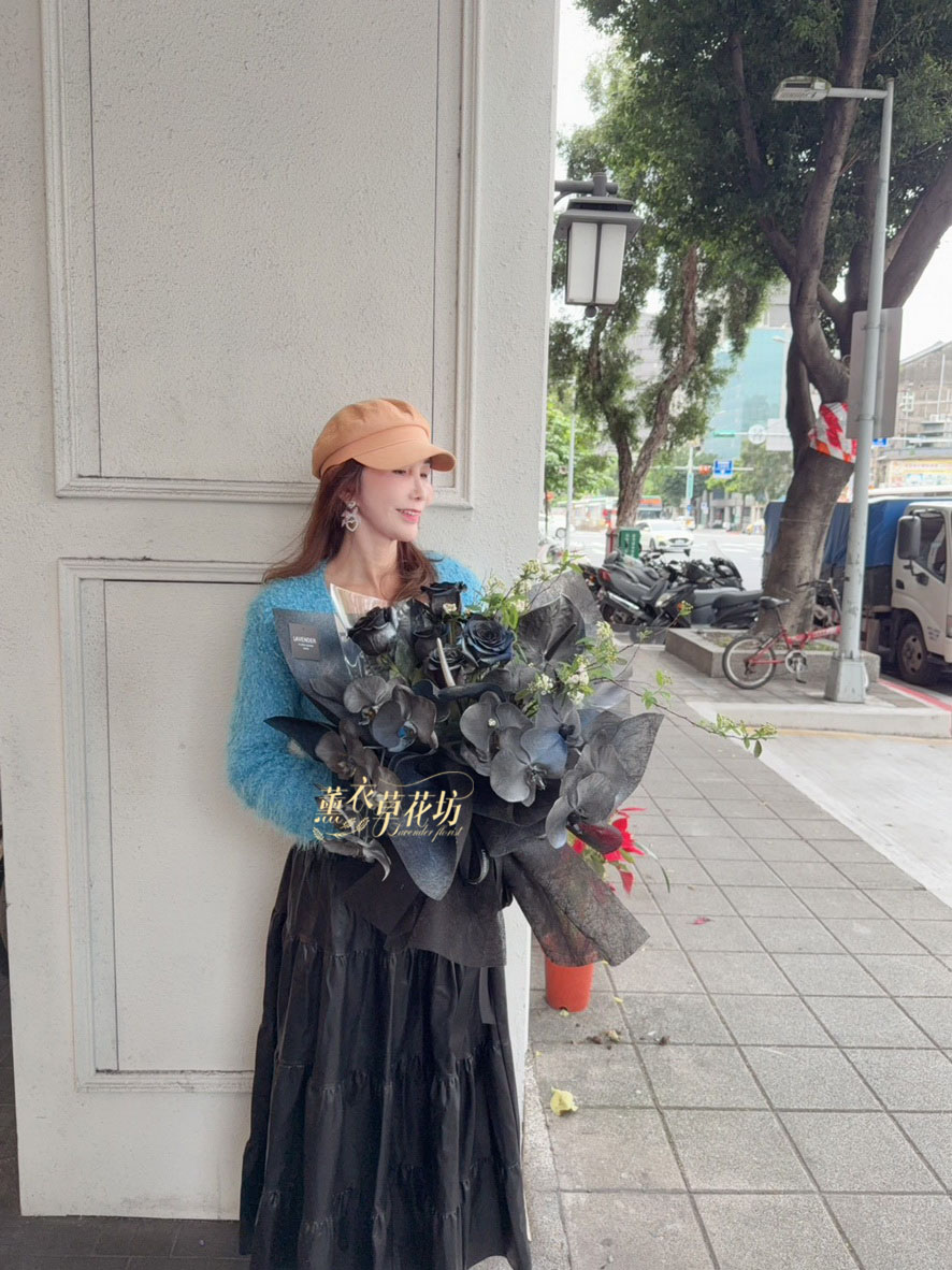 選用特殊染色蘭花、染黑玫瑰,搭配霧感包裝與流線絲帶,