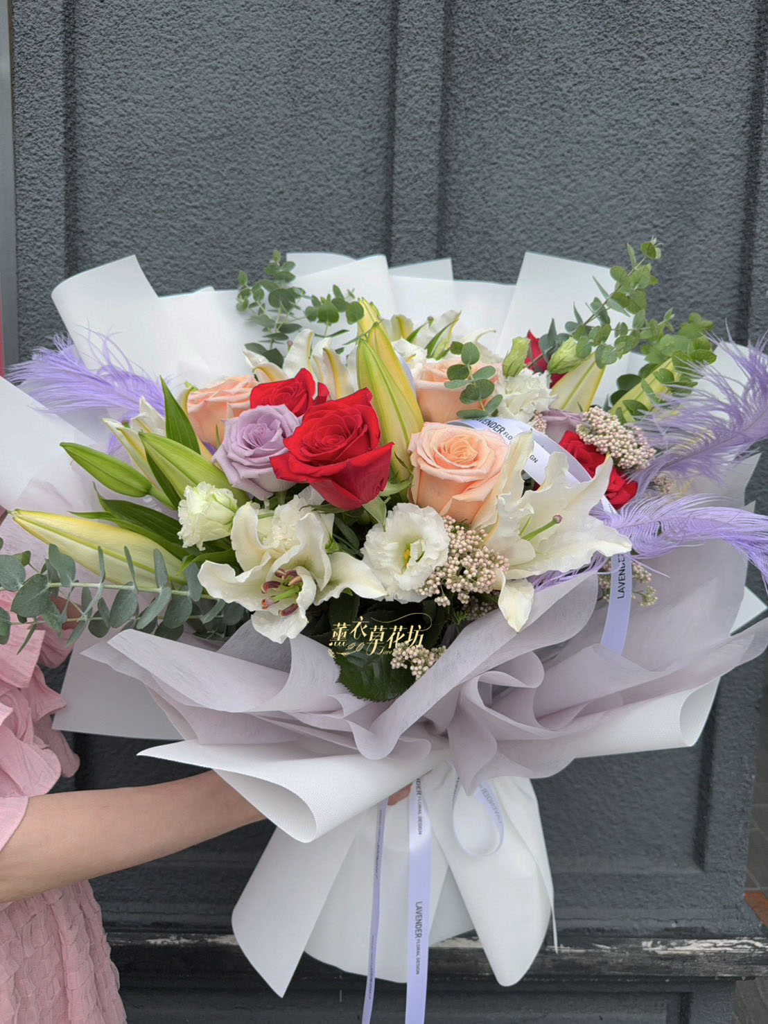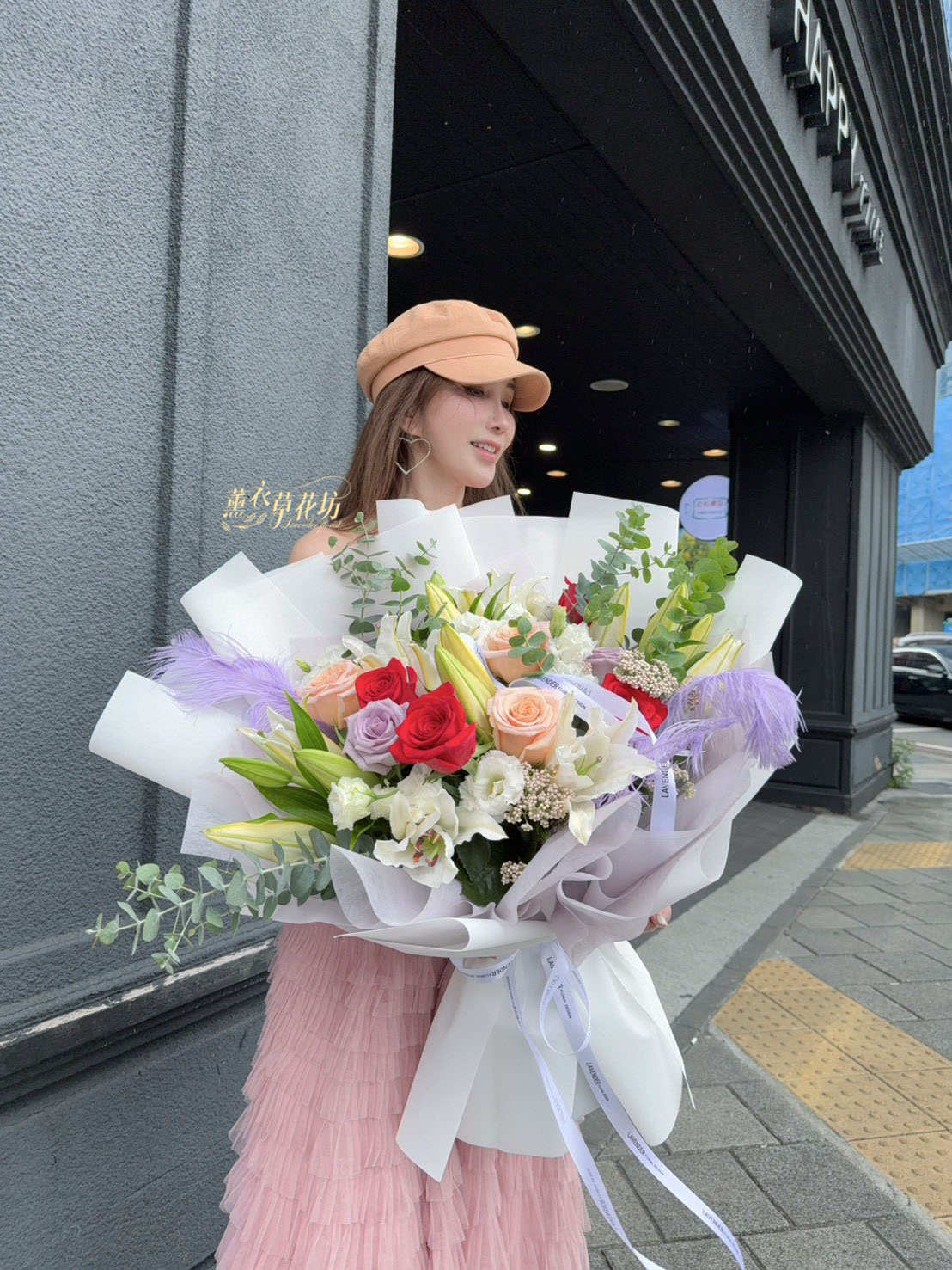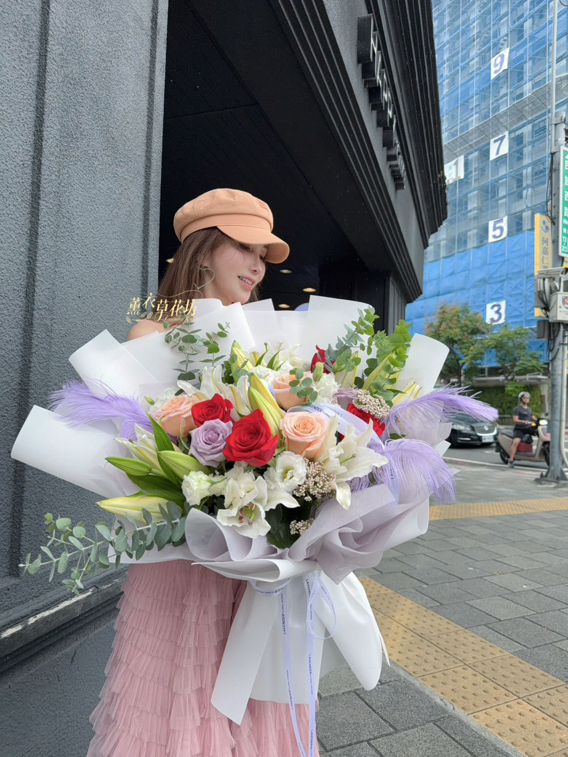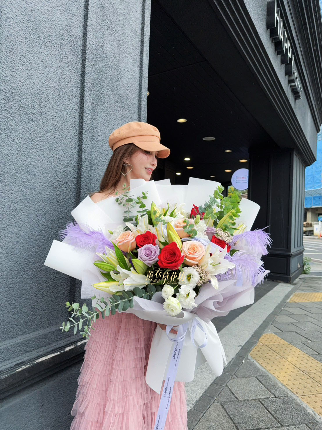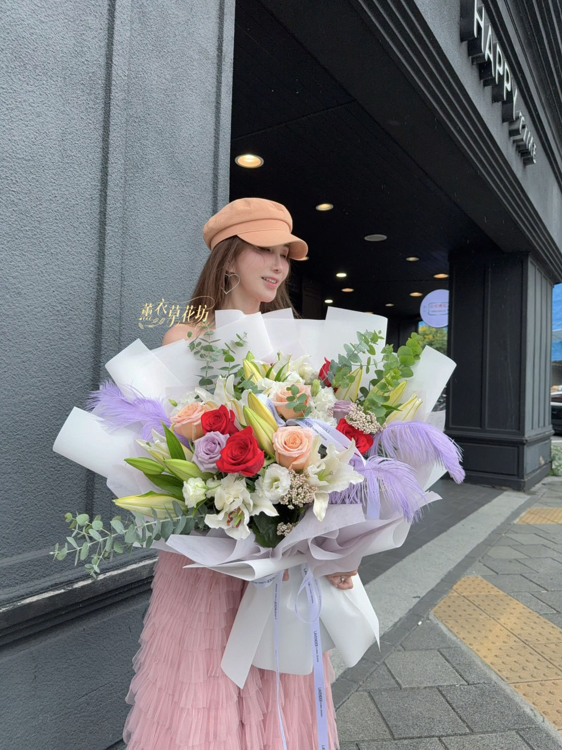【品名】進口玫瑰/香水百合/桔梗/羽毛裝飾/當季葉材~要預訂唷