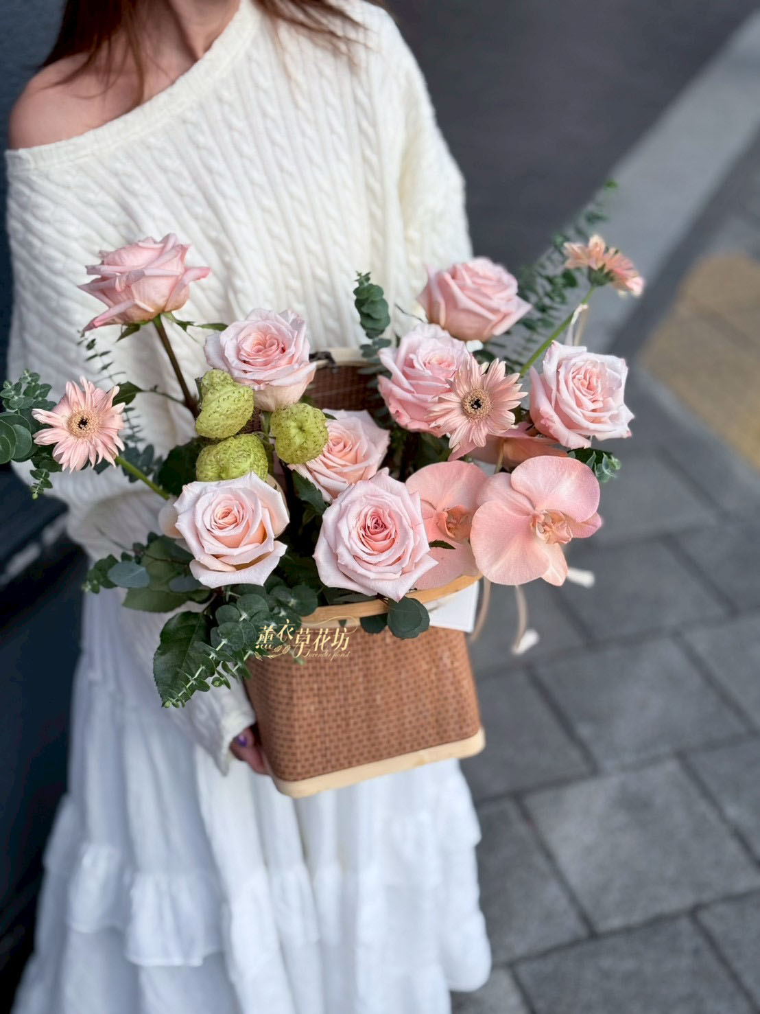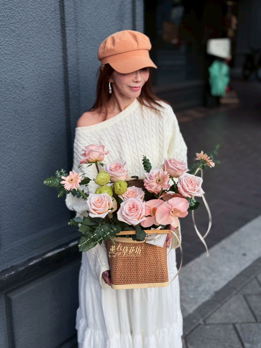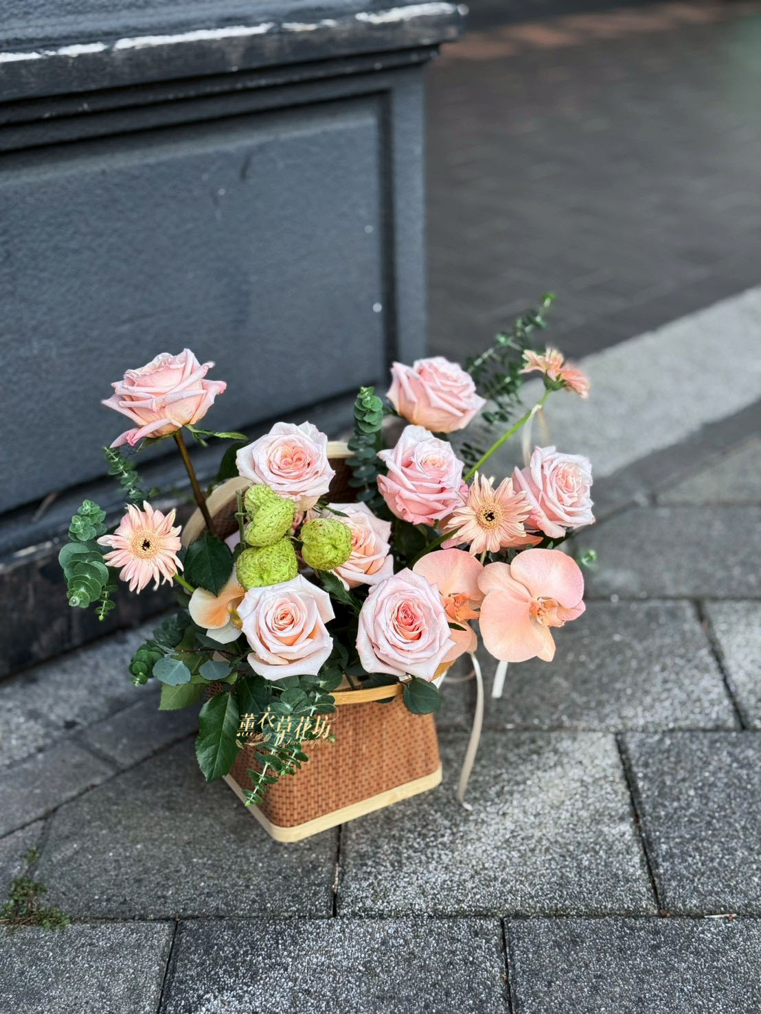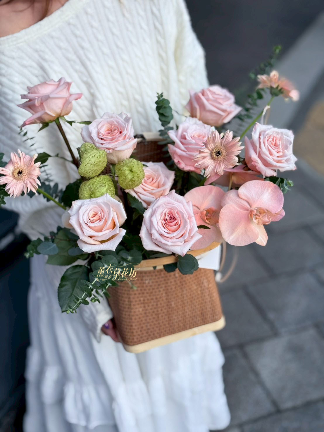 【品名】進口微光粉玫瑰&提籃設計(類似款)