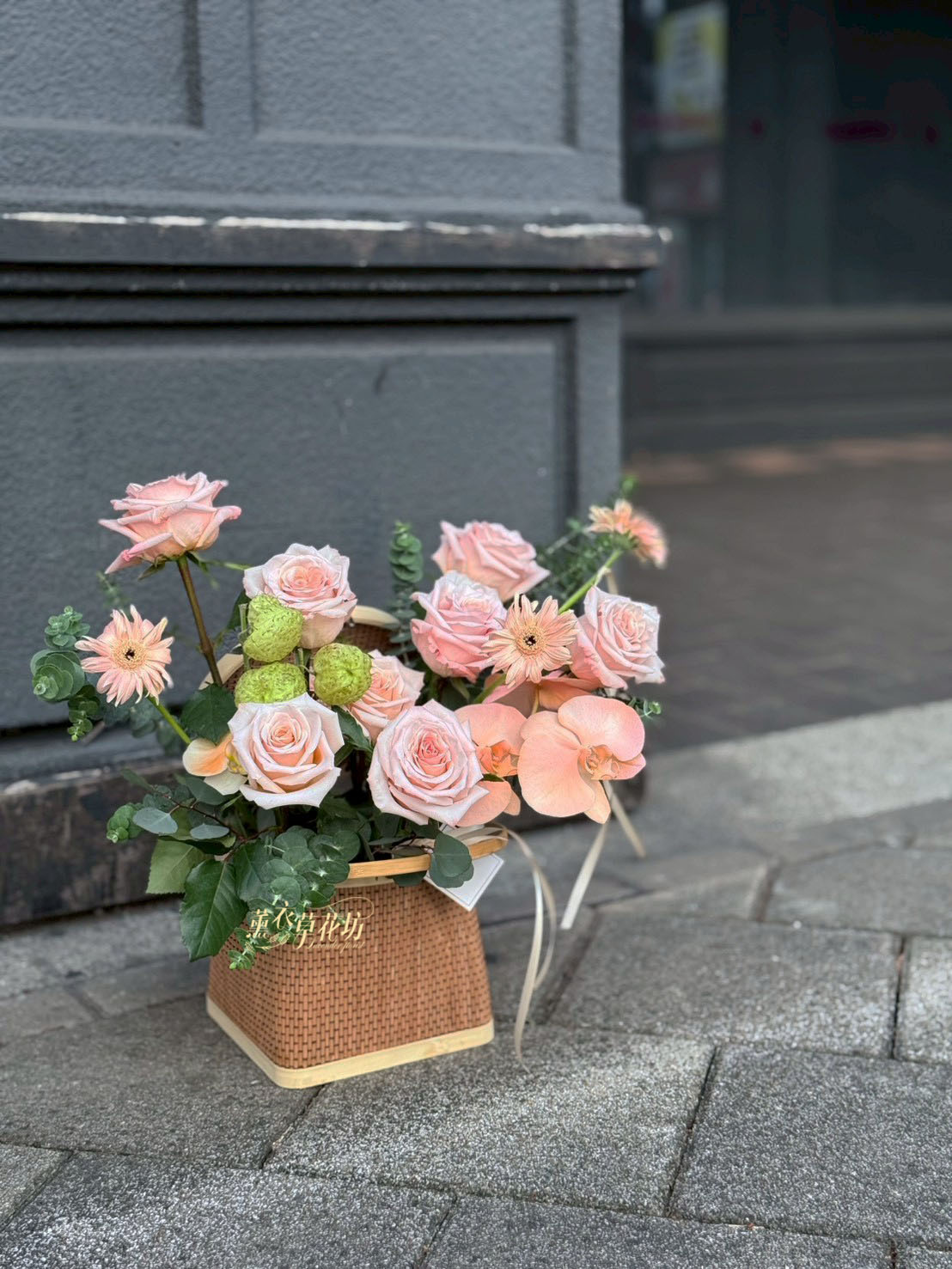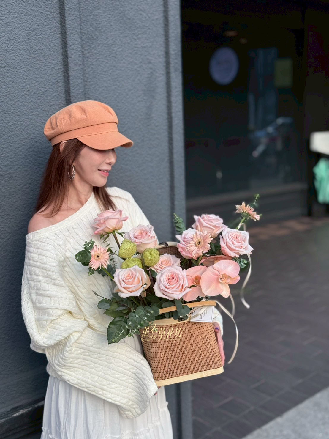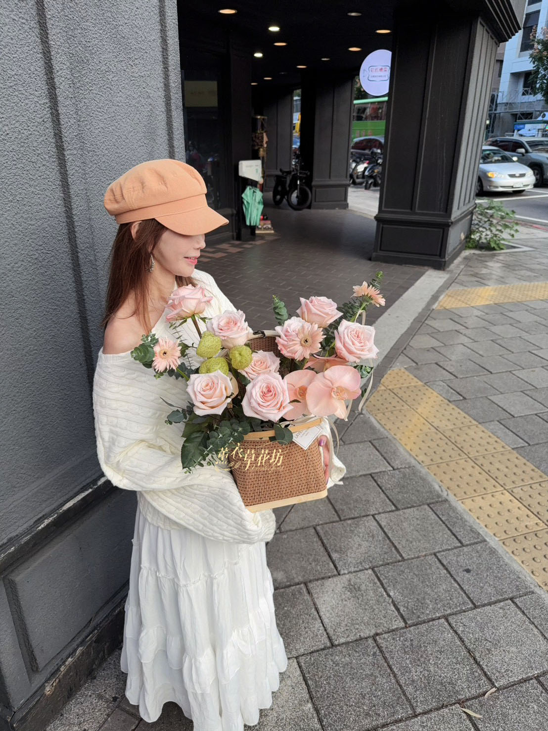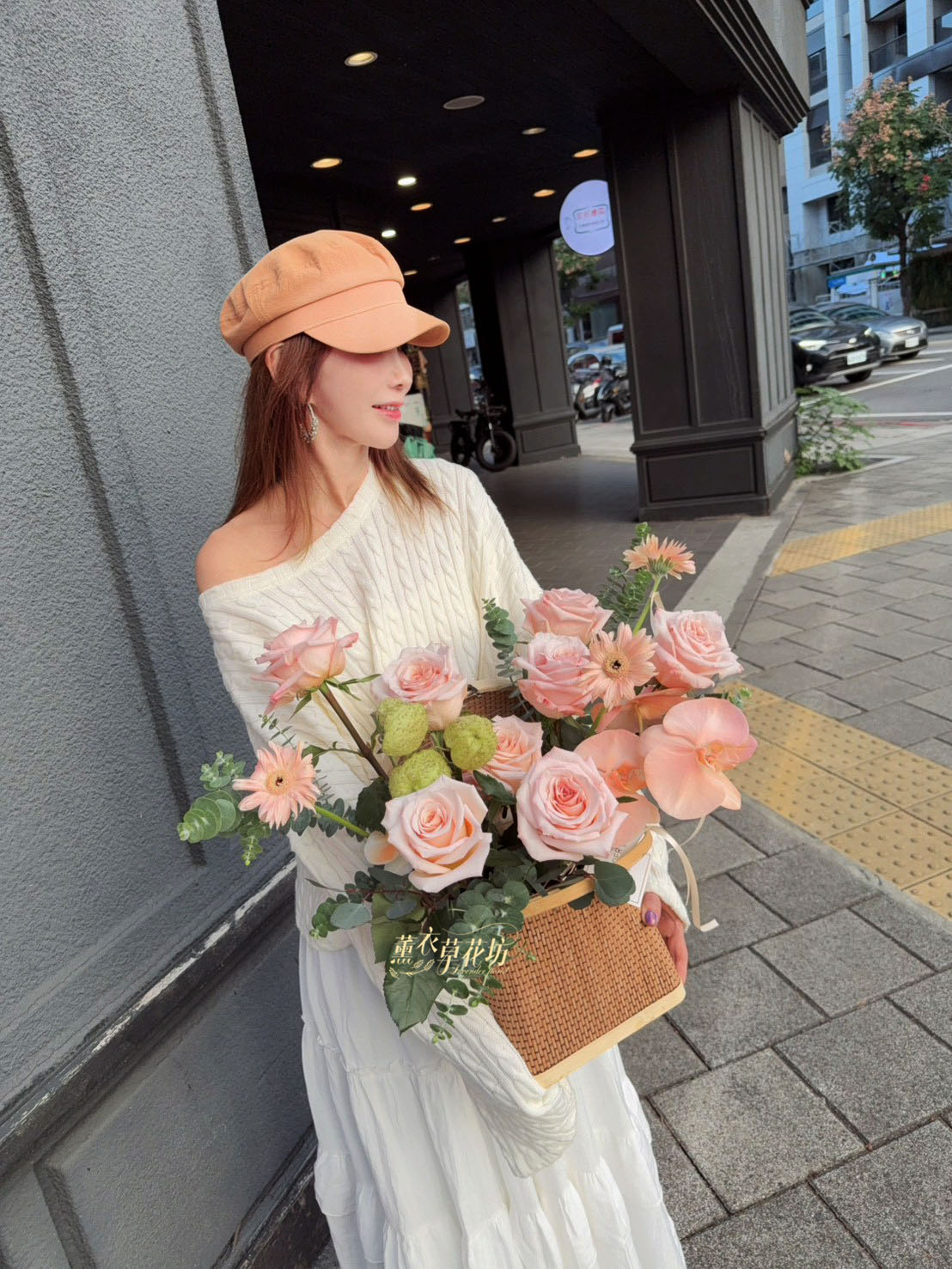 【品名】進口微光粉玫瑰&提籃設計(類似款)