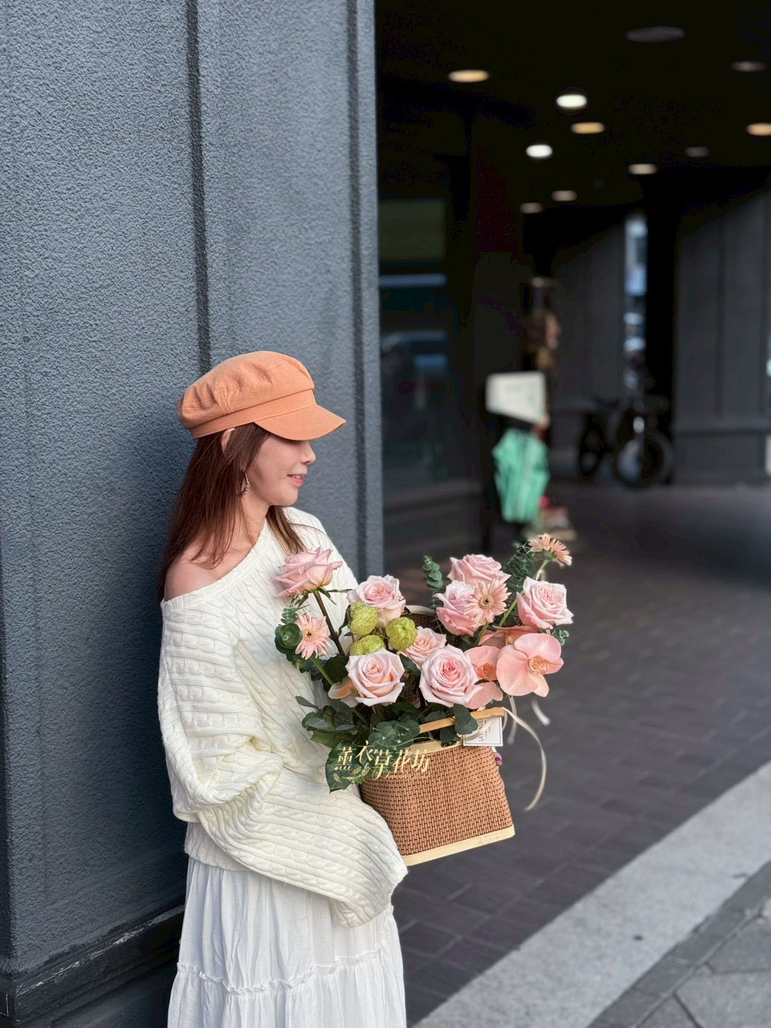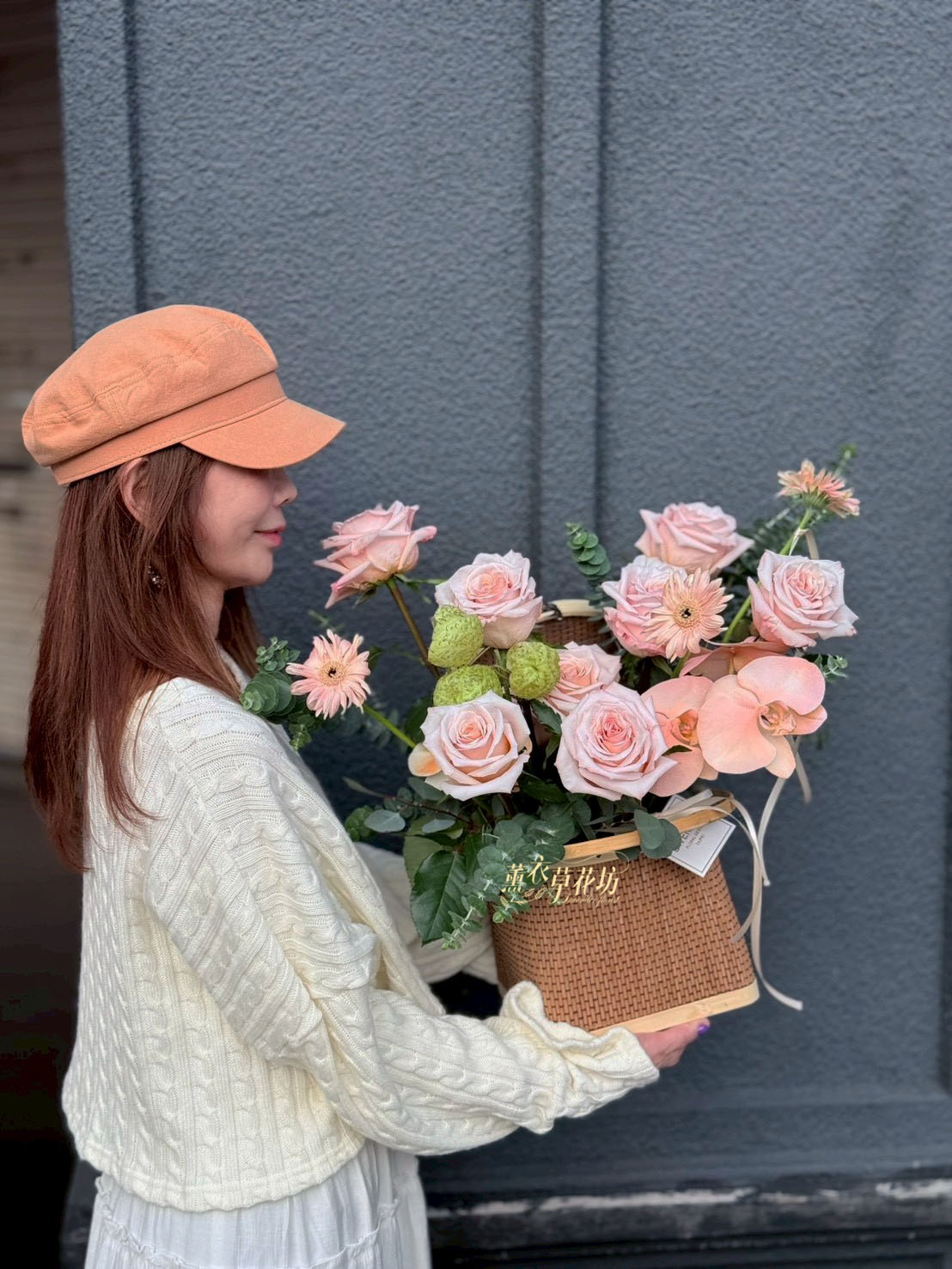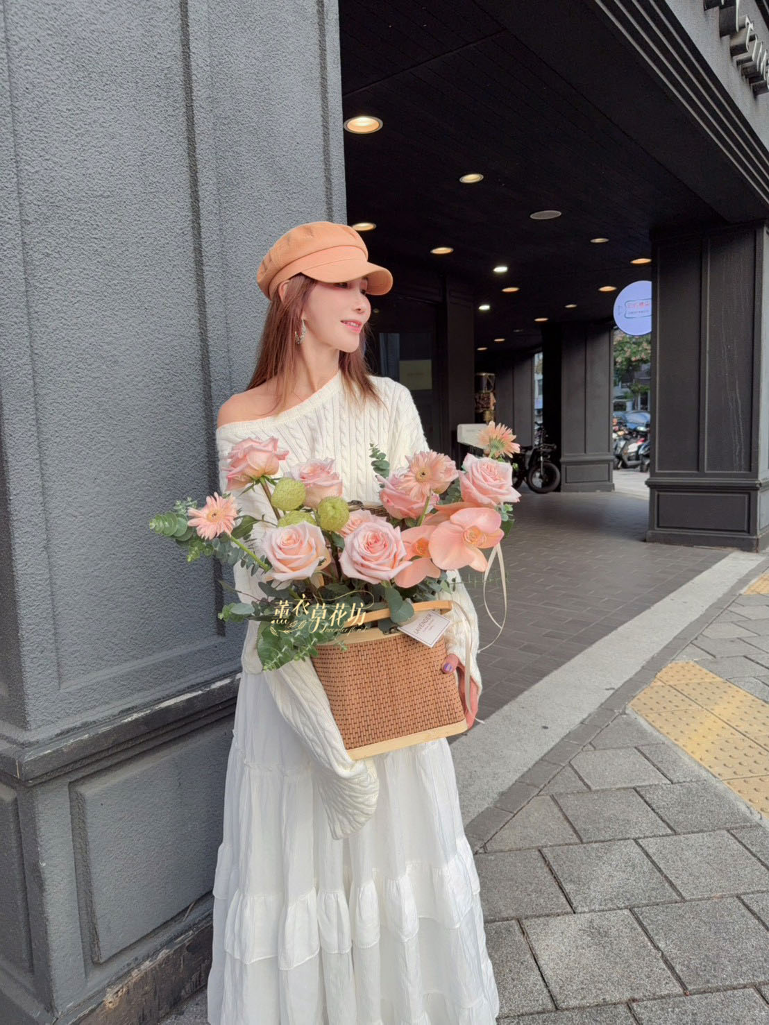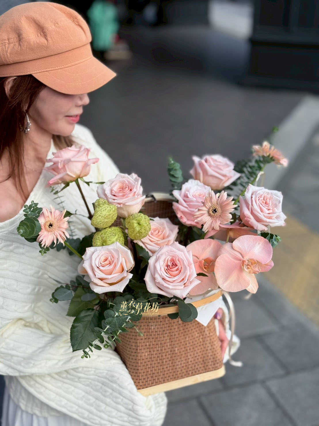 【品名】進口微光粉玫瑰&提籃設計(類似款)