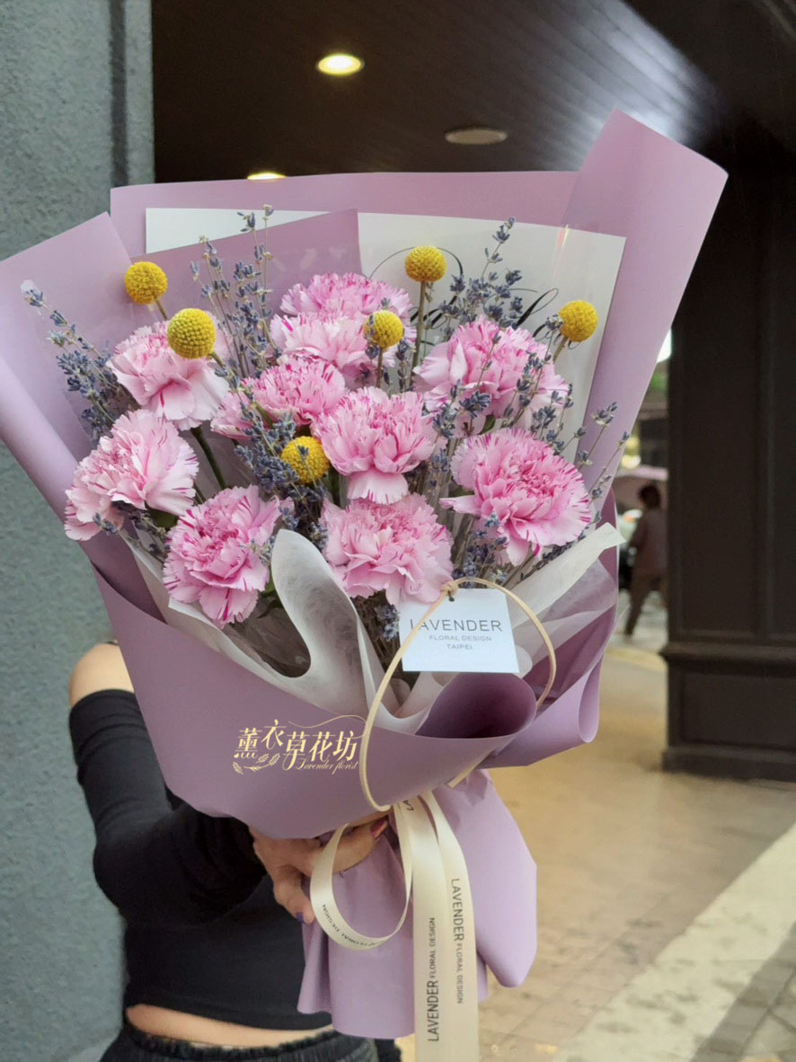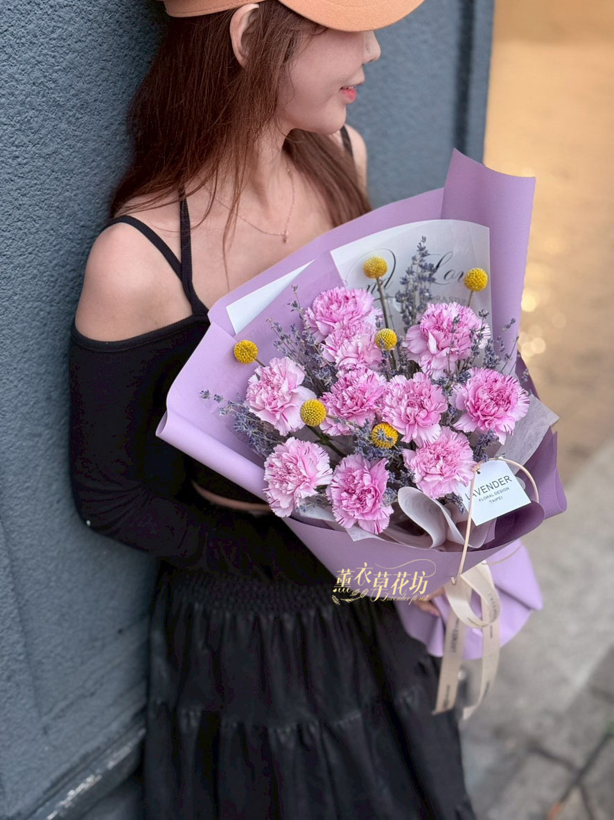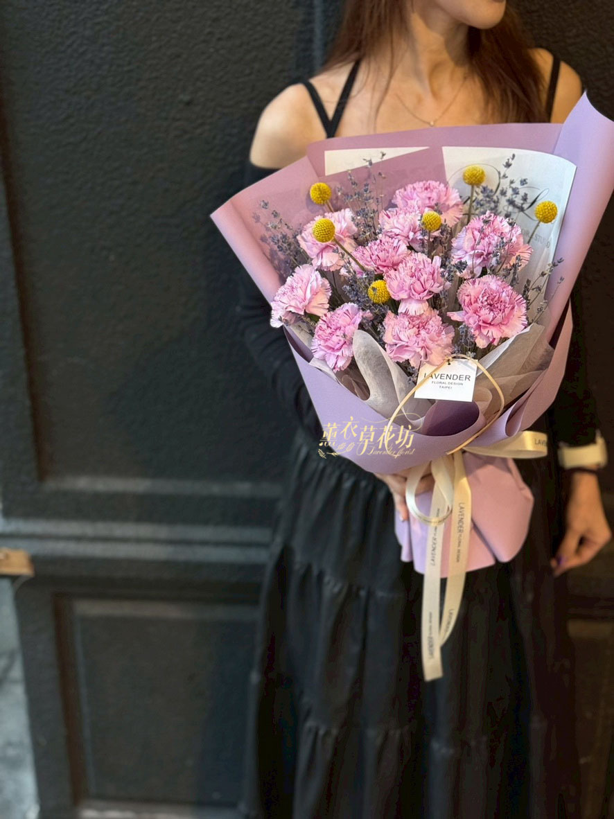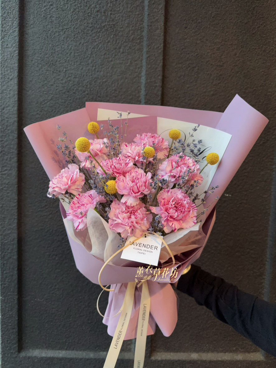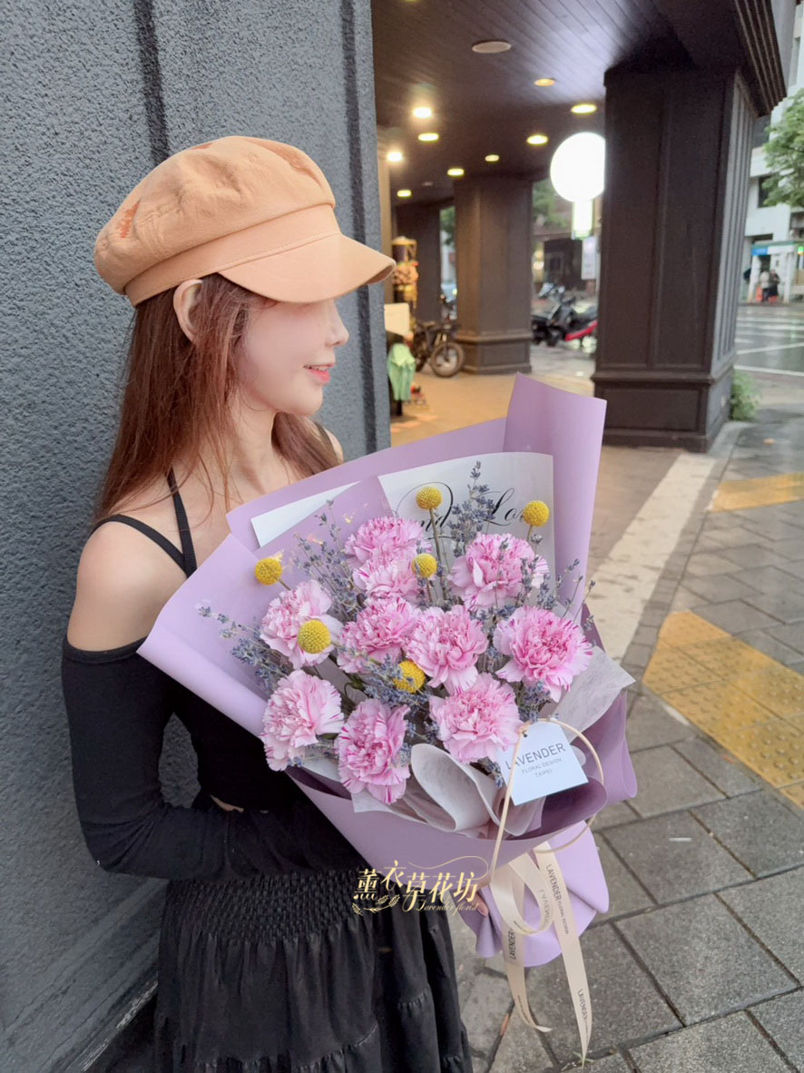 【品名】進口~新鮮康乃馨~10朵/進口乾燥薰衣草(會香香唷)/當季配花/花束.設計師搭配類似唷.請預購喔
