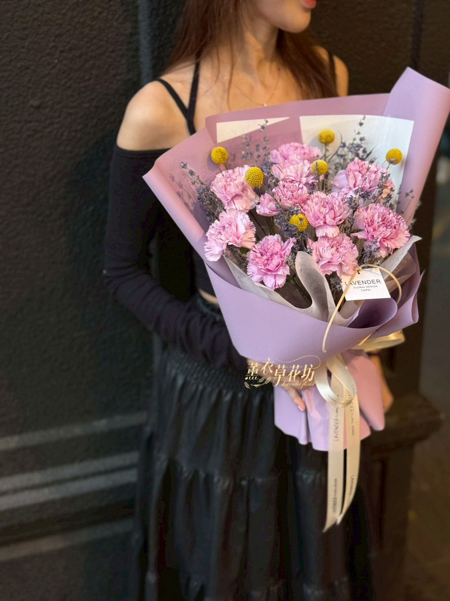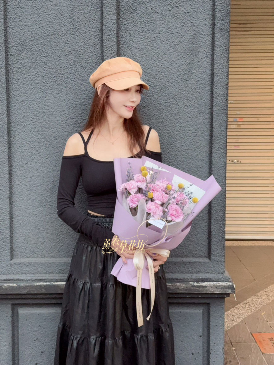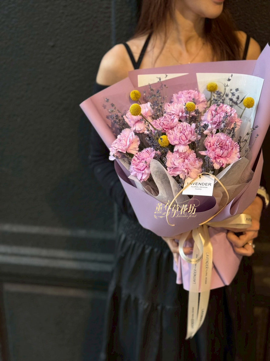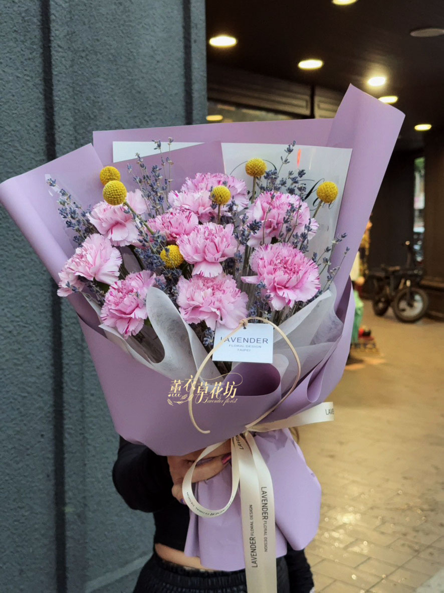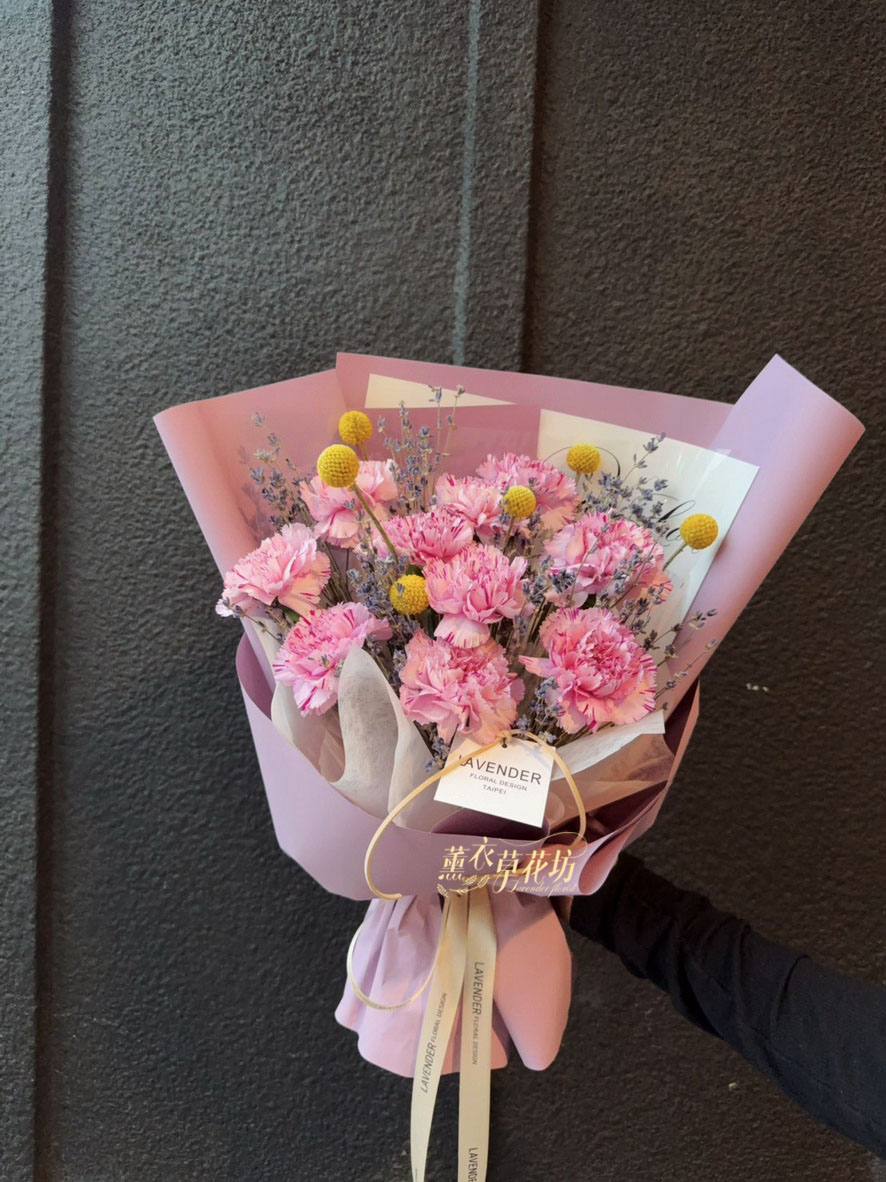 【品名】進口~新鮮康乃馨~10朵/進口乾燥薰衣草(會香香唷)/當季配花/花束.設計師搭配類似唷.請預購喔