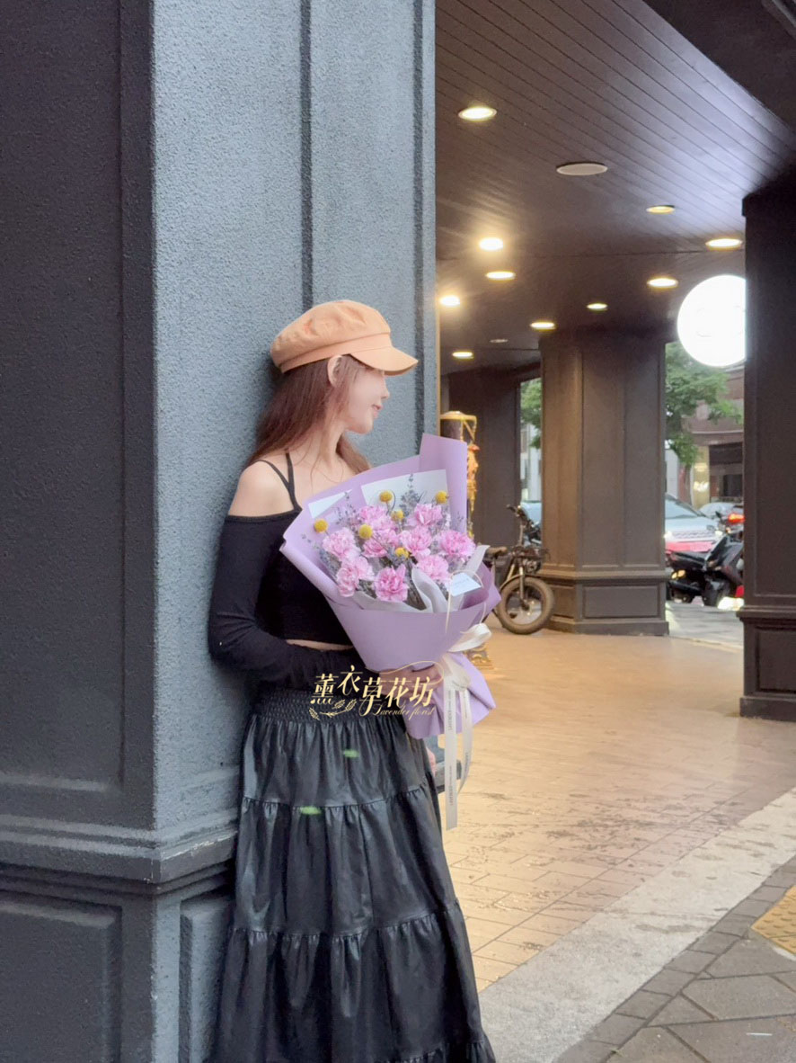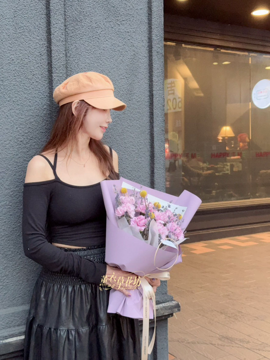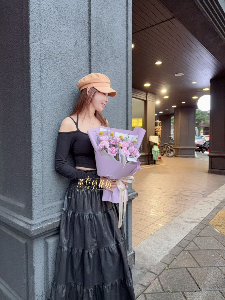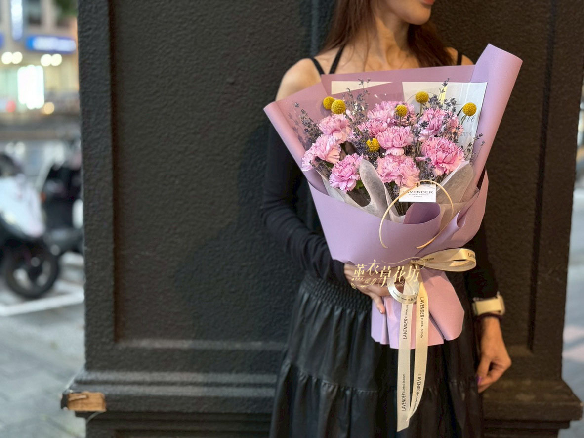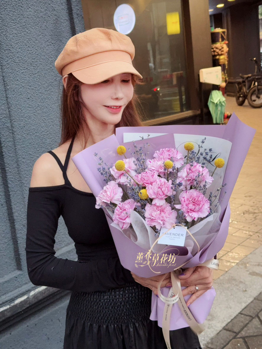 【品名】進口~新鮮康乃馨~10朵/進口乾燥薰衣草(會香香唷)/當季配花/花束.設計師搭配類似唷.請預購喔